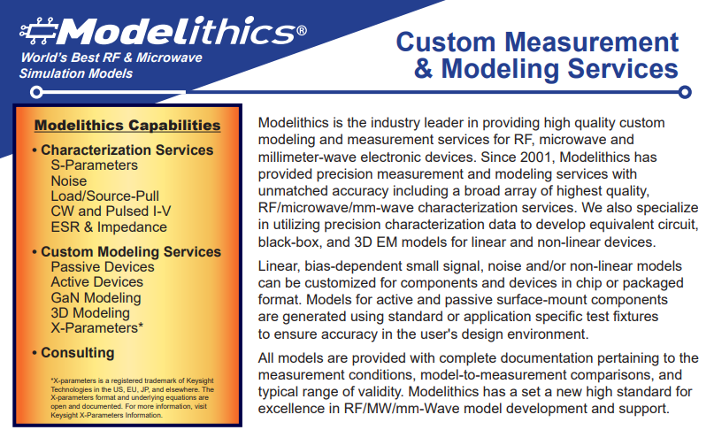 Modelithics is the industry leader in providing high quality custom modeling and measurement services for RF, microwave and millimeter-wave electronic devices. Since 2001, Modelithics has provided precision measurement and modeling services with unmatched accuracy. Modelithics has set a new standard for excellence in RF/MW model development and support.